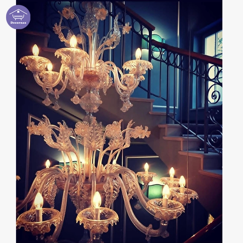 لوستر مورانو طلایی کهربایی چندطبقه پلهای با جلوه لوکس و نورپردازی حرفهای تالار و سالن پذیرایی