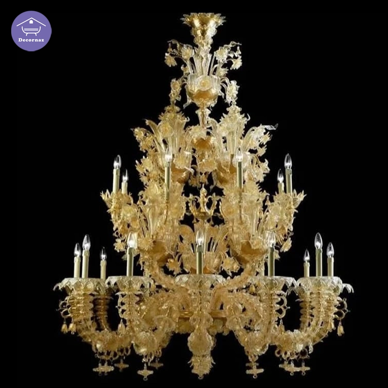 لوستر اشرافی مورانو ونیزی ۱۸ شعله با شیشههای کهربایی با و نورپردازی لوکس پذیرایی و تالار