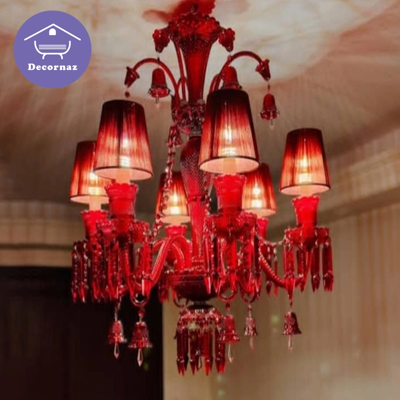 لوستر شش شعله زنیت با کریستال قرمز و شید با جلوه لوکس و خیرهکننده برای پذیرایی